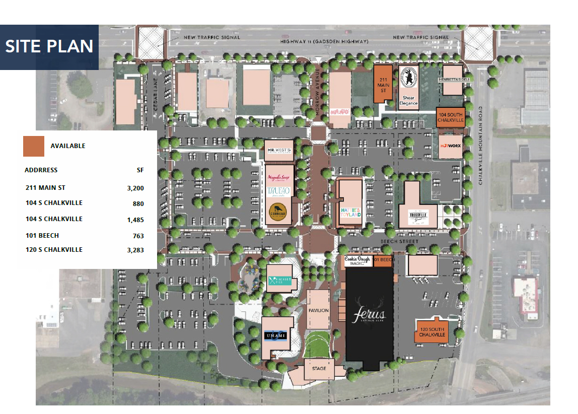 Located at the highly visible corner of Highway 11 and Chalkville Road, this 12-acre mixed-use district has transformed historic downtown Trussville into a vibrant destination for dining, retail, and community gatherings. The walkable development features a central event lawn with stage, covered pavilion seating, pedestrian-friendly streetscapes, public parking, and green space designed to host concerts, festivals, and year-round community events.